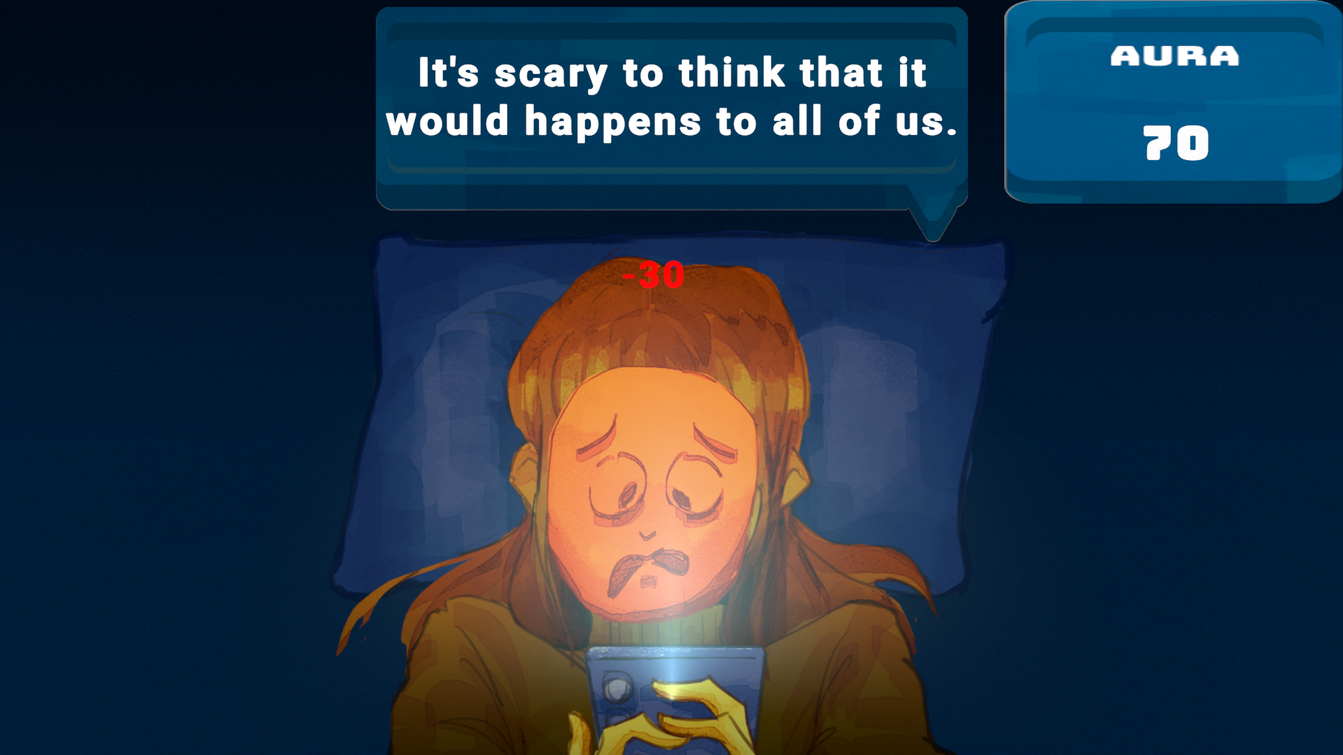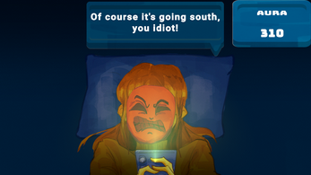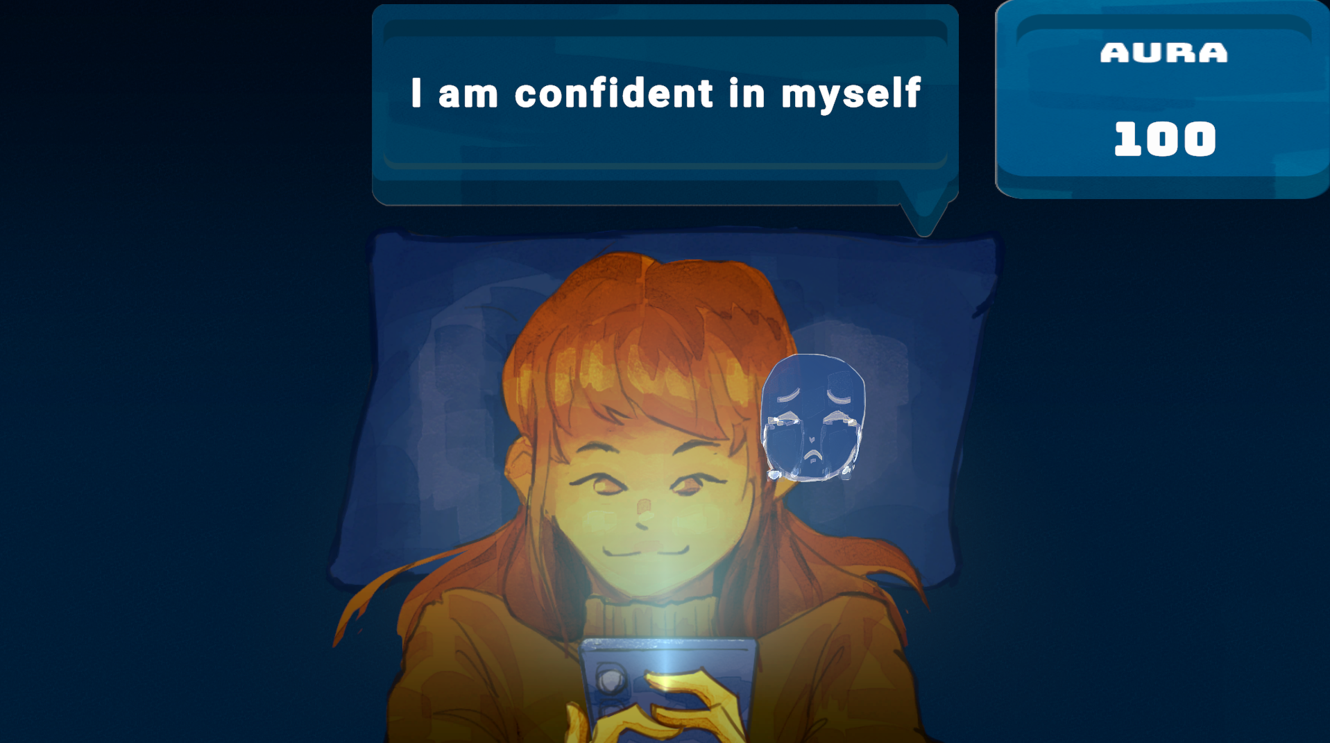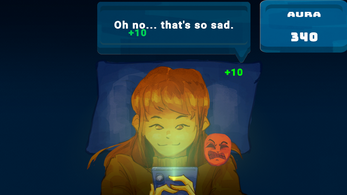 The game is about a person doomscrolling through social media when negative emotions in a form of mask keeps approaching, making the character emotion changes and loses aura. The game combine whack-a-mole reaction with bullet hell, as masks spawn faster over time.